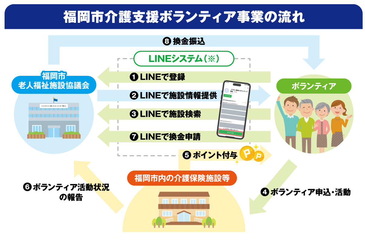 65歳以上の高齢者が介護保険施設等でボランティア活動を行うと「ポイント」が付与され、たまったポイントを換金または寄附することができます。
